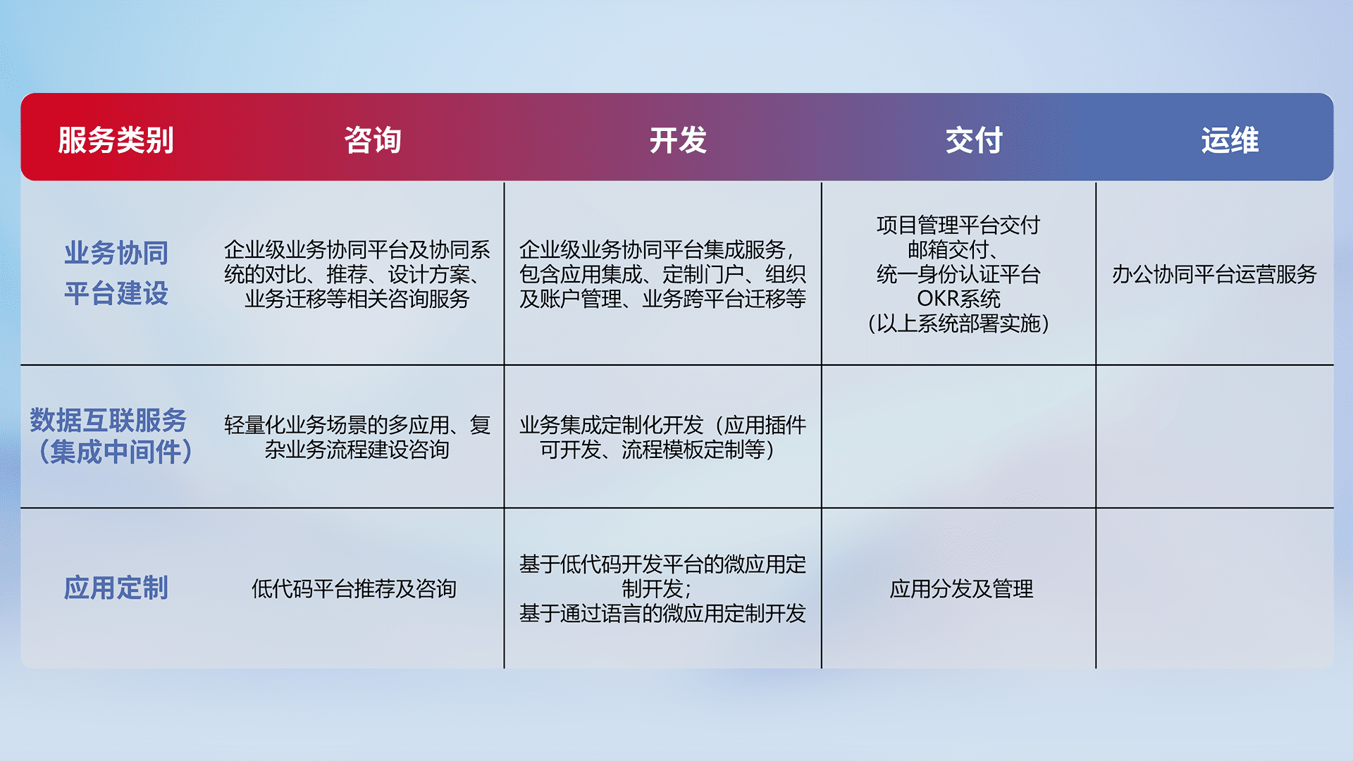 针对钉钉、、、、企微、、、IDaas等平台级产品提供产品的规划、、、方案、、、交付、、、定制化开发等服务,,实现如统一协同办公、、、、智能客户服务、、、混合会议管理、、、智能数据查询、、、、等业务场景,,实现数字化转型。。