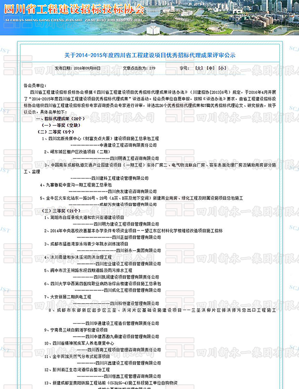 2014-2015年度四川省工程建设项目优秀招标代理成果评审公示