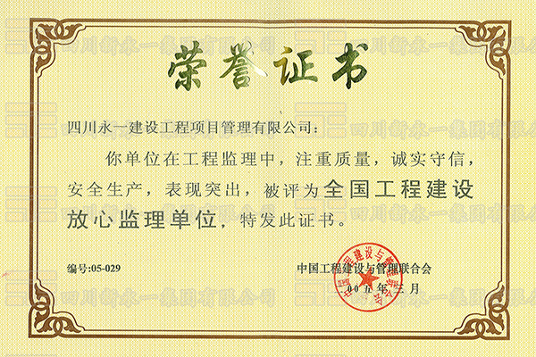 • 全国工程建设放心监理单位荣誉证书