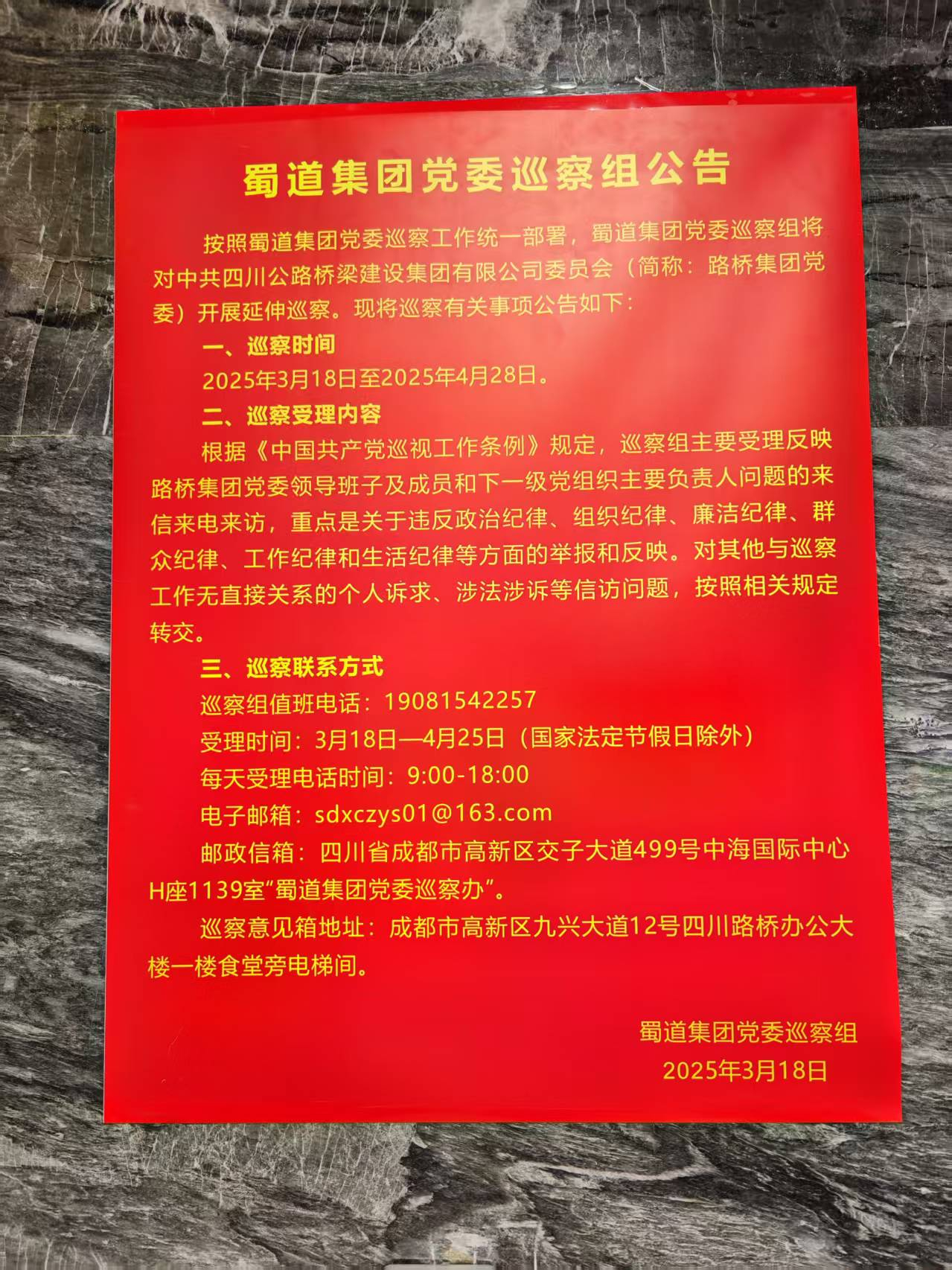 蜀道集团党委巡察组公告 按照蜀道集团党委巡察工作统一部署,蜀道集团党委巡察组将对中共四川公路桥梁建设集团有限公司委员会(简称